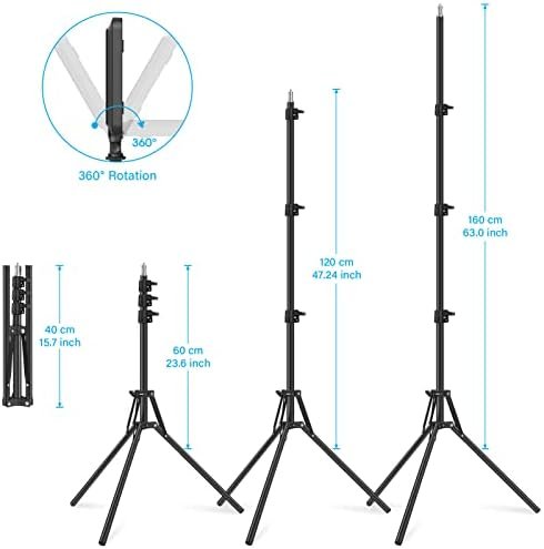 • Variable Height: Collapsible Tripod Base and adjust the height from 23.6″ (60cm) to 63″(160cm) by loosening and tightening the knob attached to the main stand. It folds down to 15.7″/40cm for storage and transport